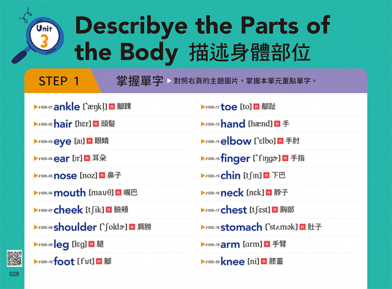 看一看圖片,學習裡面的重點單字。播放音檔,聽美籍老師的發音,跟著唸兩次。