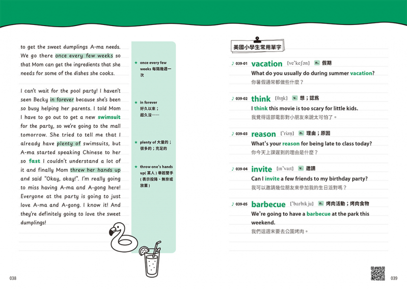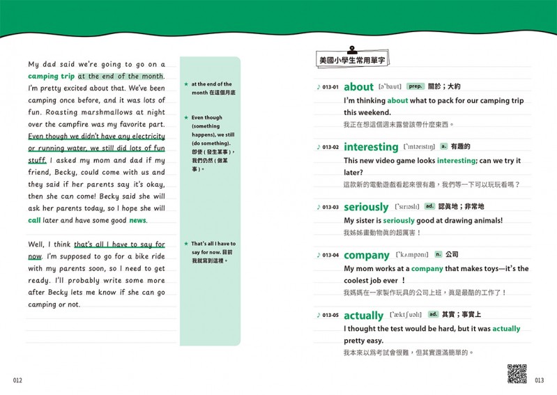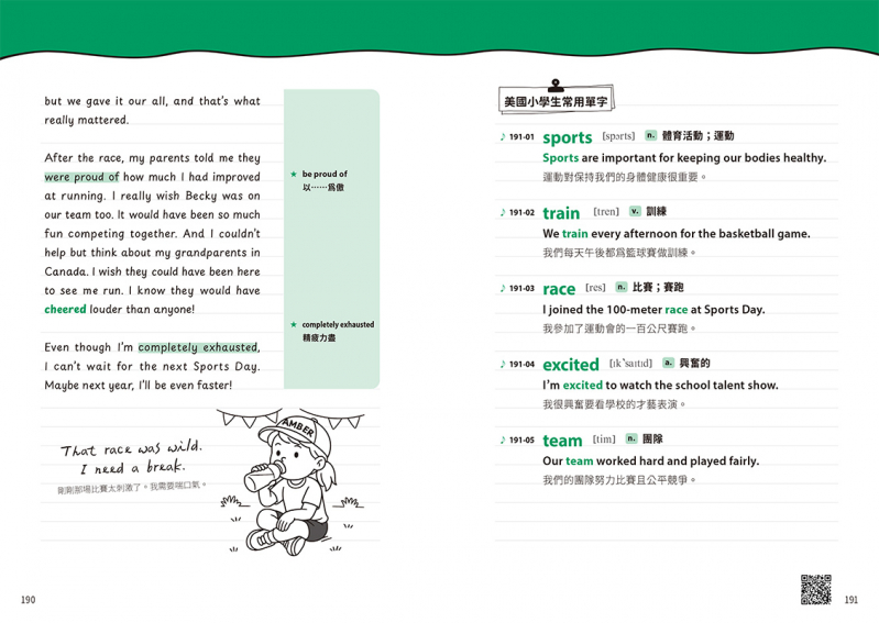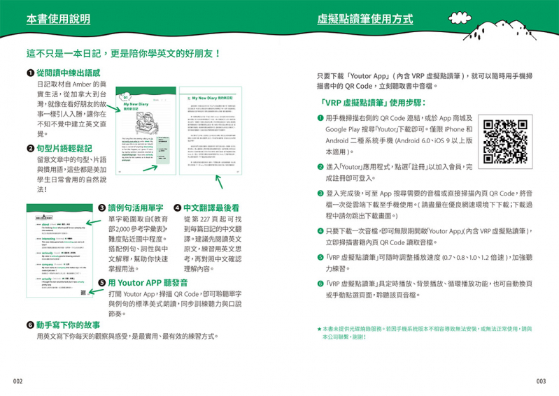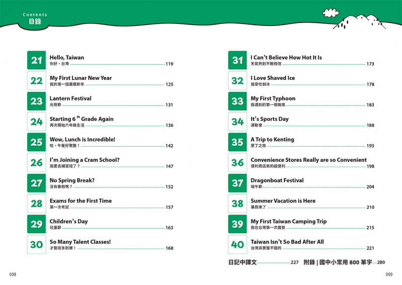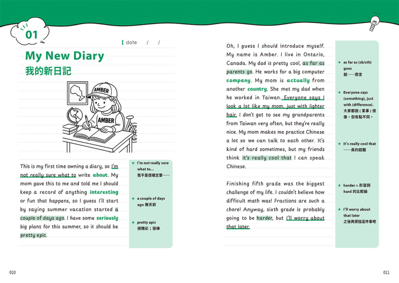 每篇日記都包含了文法重點。我知道,你現在心裡可能在說:「文法好無聊。」但文法真的很重要,所以書裡會提供一些你可以練習的例子。