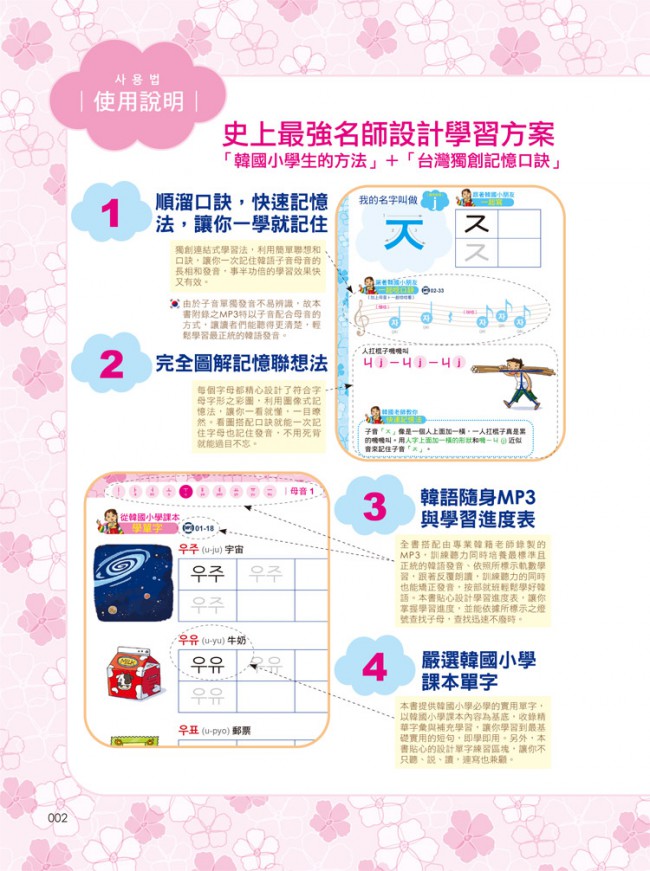 以韓國小學課本為基礎,台灣人學韓語的盲點為切入。用韓國小朋友常玩的繞口令、文字遊戲等,趣味化學習韓語基本發音,更貼近韓國人初學韓語的方式學習。並獨創最適合台灣人的方法,「直覺式」、「口訣式」、「圖像式」一次就把韓語40音牢牢記住。