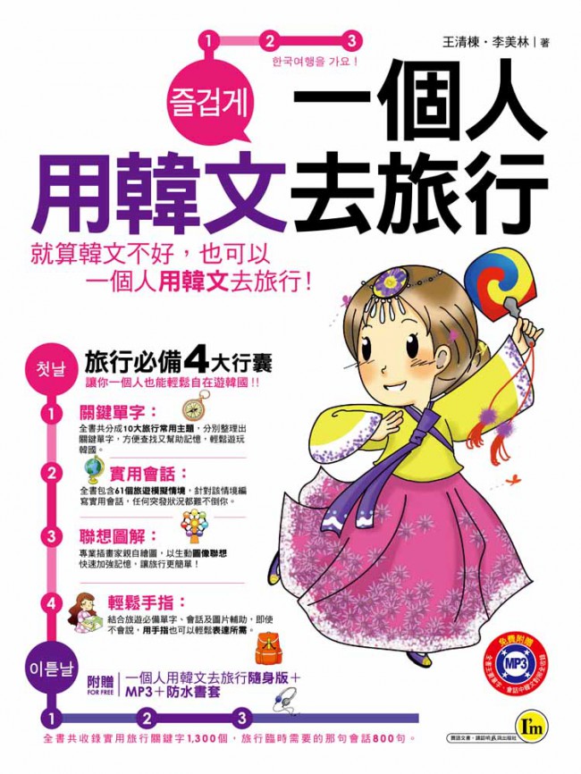 本書設計是希望讀者就算是一個人,也可以輕鬆到韓國旅遊,韓文不熟練沒關係,說得不標準也不會影響,只要再遇到需要溝通的場合臨時說不出來時,利用書中的關鍵句子,表達你的需求。即使說不出來,用手指指出書上的字,也能和對方溝通。無論是登機或是到了當地購物等場景,都有適合的內容可以參考使用。到外地旅遊好玩的地方就是這樣,說一些當地的語言加上比手畫腳,不要害怕嘗試說韓文,因為只有說出來才能有所突破進步。