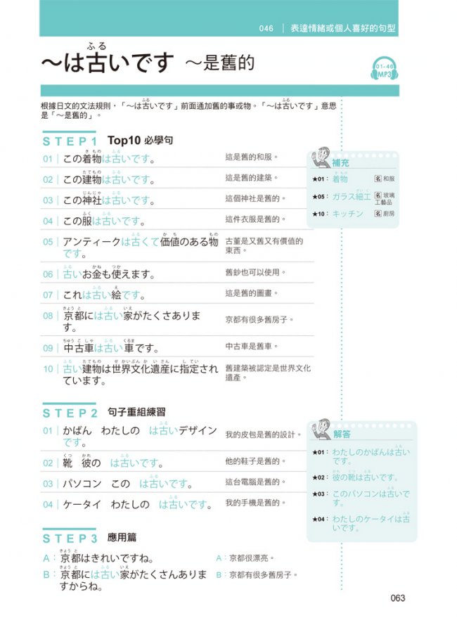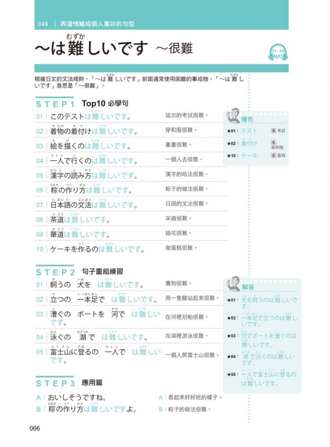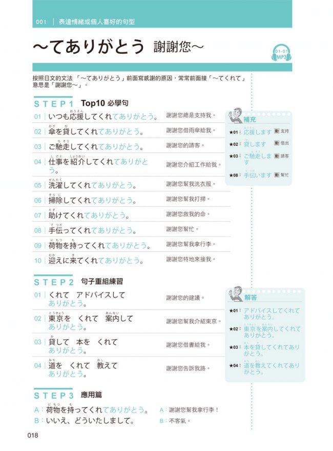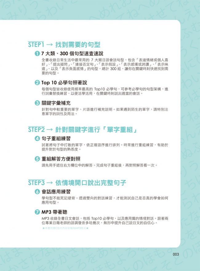 根據書中的對話情境進行練習,並聽MP3,向日籍老師學習正確的語調,提升說日文的自信。