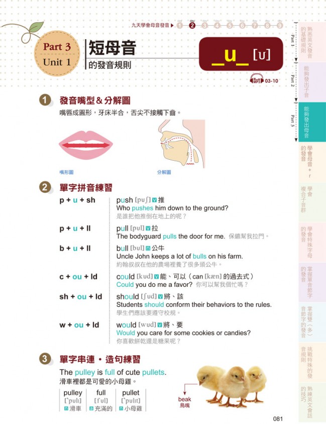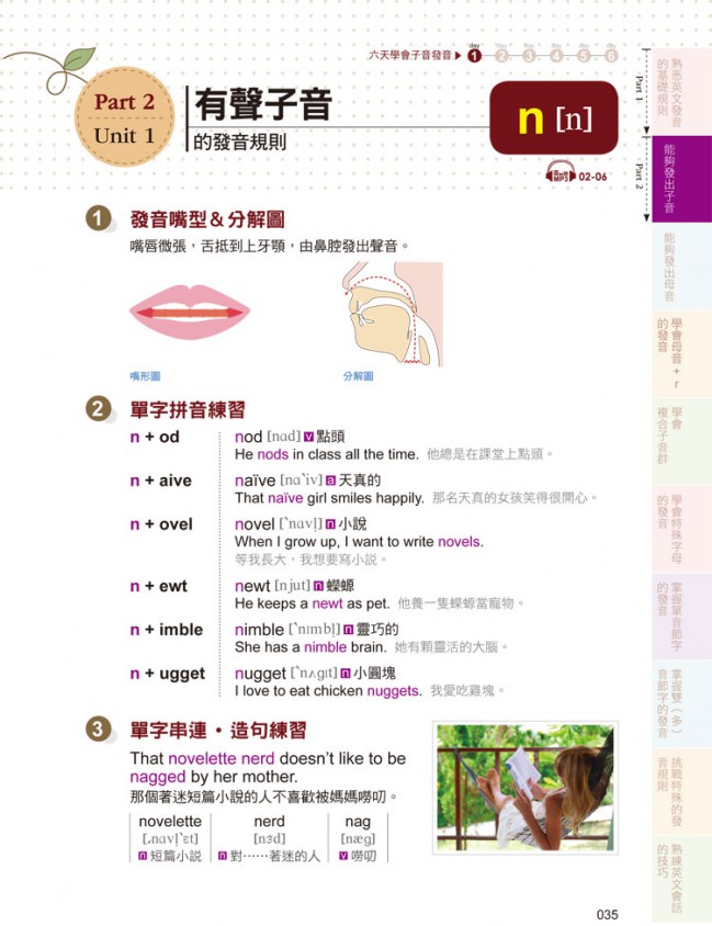 每個發音規則一開始皆提供發音嘴型以及發音分解圖,以圖片與文字相互配合,講解發音的方式。
