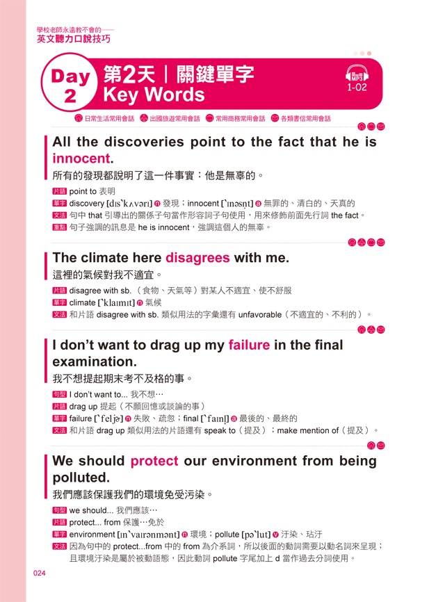 每個技巧皆在每週的剛開始做整體的講解,方便讀者先掌握該週的學習重點,並在該週反覆練習運用。而為了讓讀者一次學習到最完整的英語,作者更在每個句子的下方詳盡補充句型、單字、片語、文法,更針對特殊的例子補充說明在英語聽說上需注意的事項,讓讀者不僅學會英語聽說技巧,基本英語能力也一併提升 !