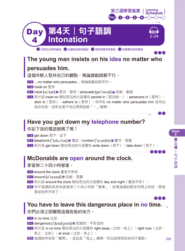 第三週學習重點—句子語調 (intonation),中文說話的高低起伏,和英文中的高低起伏,其實是非常不同的喔,唯有模仿以英語為母語的外國人說話的語調,才能夠說得道地。本書獨創以圖象表示語調起伏,並以套色字凸顯句中語調需上揚的關鍵地方,搭配箭頭標示句尾的語調變化,使讀者更容易掌握語調的高低起伏,才能夠說得自然。
