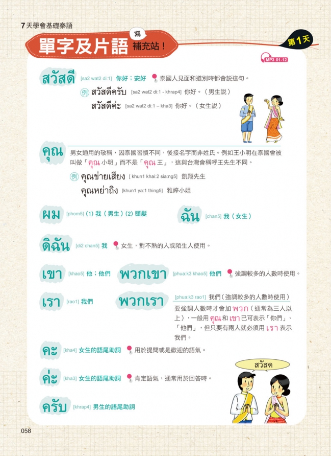 且不從如此功利的角度看待泰語,因為泰國原本就是熱門的旅遊國度,雖然基本上在泰國自助旅行的難度不高,但若能以當地語言跟在地人互動,必定能在旅途中認識更不一樣的風貌,也更貼近真實的生活。除此之外,泰國的戲劇和電影近年來的表現均十分亮眼,也開始有片商引入鬼片以外的其他片種,泰國的流行歌曲風格新穎多變,隨國際潮流不斷革新,學習泰語即能以第一手的方式欣賞這些影視音樂作品。雖然上面落落長地羅列了各種好處,但學習語言是否真的需要這麼多理由?其實我們只需要給自己一個很簡單的動機,也就是去發現這個世界,多瞭解一種語言就是增進我們對這個世界的認識,西方便曾有學者提出語言極可能形塑了我們對世界的看法,比較簡單的例子就是某些住在雪地的民族可能有大量的詞彙以形容雪的狀態,生活高度依賴牲畜的民族則可能有大量的詞彙描述牛群和羊隻,又或者是台灣人熟悉的日語,便充滿了大量的敬語和婉曲形式,某種程度上反映了日本人拘謹的人際互動關係。從語言出發,可以讓我們更近距離地靠近各地的文化和人群,並試著從他們的觀點看這個世界,從而對各種差異甚至所謂的「奇風異俗」更有同理心,這就是學習語言最大也最無以估量效益的珍貴價值。西方語言哲學巨擘維根斯坦曾經說過:「語言的限制就是世界的限制(The limits of my language mean the limits of my world.)」,的確,語言的隔閡有時彷彿廣闊無垠的海洋,阻礙我們看清楚遙遠的彼端,而出海探險總是需要載具,希望這本書能夠成為那艘可靠的小船,幫助讀者探索這個多彩的世界。