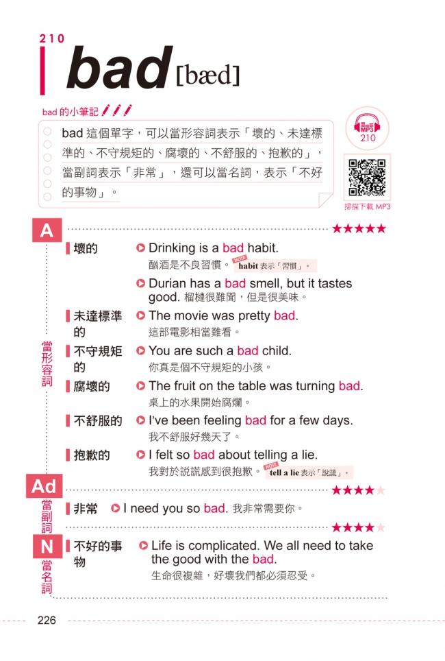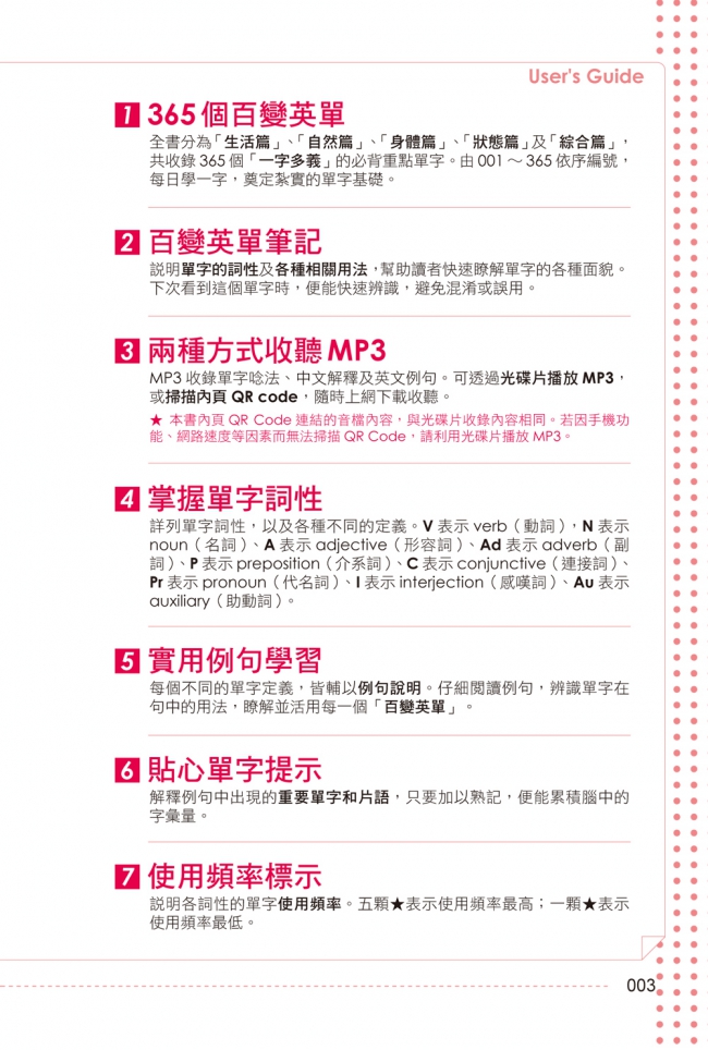 MP3收錄單字唸法、中文解釋及英文例句。可透過光碟片播放MP3,或掃描內頁QR code,隨時上網下載收聽。