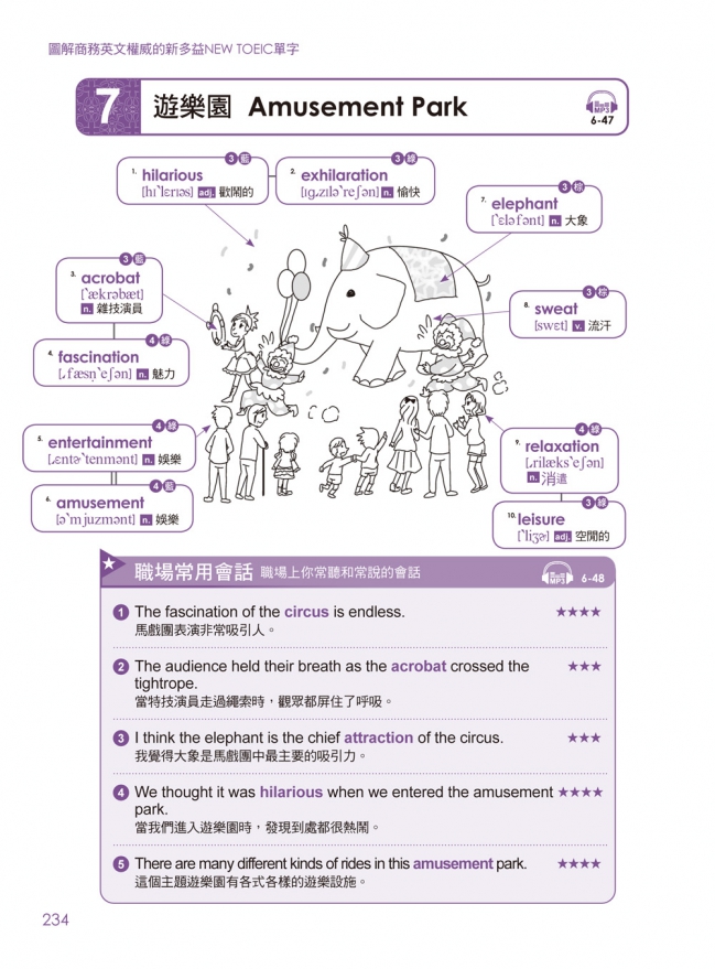 專業名師一致公認,台灣讀者最缺乏的是「用英語溝通」的能力。單字背再多、文法懂再多,無法實際應用等於都是白學。本書利用「情境全圖解」的方式,將單字套入必備的職場及國際上的生活溝通中,馬上學、馬上應用,加強記憶同時瞭解單字用法,一舉數得!