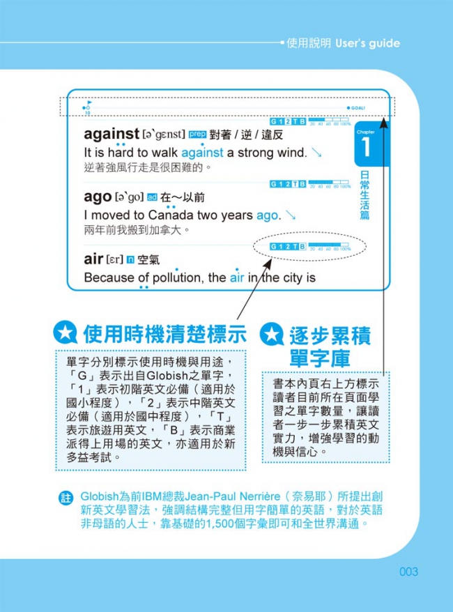 「Globish」指的就是全球化英文(Globalized English),它是由Global以及English所組合出來的組合字、也可以被稱為精簡英文(truncated English),一般人乍聽之下可能會覺得把英文精簡後可能是一件壞事;但其實不然,全球化英文捨棄一些地區性的英文用法像是俚語、地方用字以及方言,剩下的部分就是精選英文重要的架構。現今的學生應該學習的就是全球化英文;畢竟、比起只在某些特定地區才通用的地區性英文、能夠流利的運用一般大眾所廣用的基本英文反而來得重要許多。這本書提供給讀者的就是英語學習的基本「骨架」。