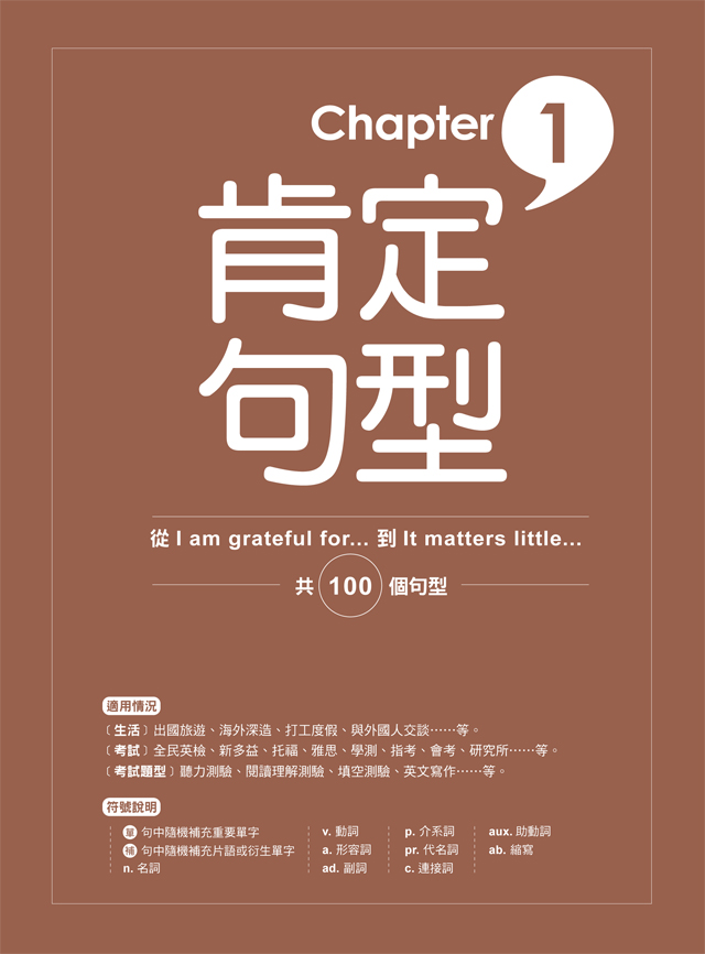 《學一次用一輩子的萬用英文句型》這本書,介紹了400個常用句型,其中包括了肯定、否定、疑問、假設句型,這些句型不僅適用於生活情境的口說,在英文檢定的聽力、閱讀、寫作、口說等題型,也都完全適用喔!裡面的內容,很符合這個書名,真的是學一次,就能用一輩子了!