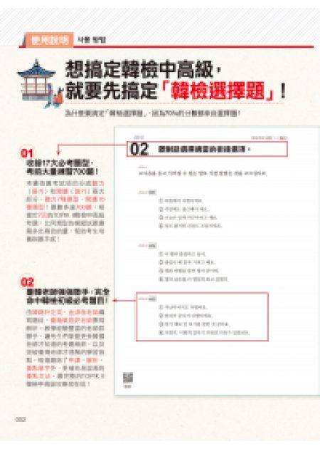 另外本書也融合了我親身在教育現場教授韓文中高級班課程時所累積的經驗,蒐羅了絕對會出現的題型、中高級程度絕對要熟記的語彙,以及作為考生不得不知的必考文法等,內容豐富充實,備考看這一本就足夠!