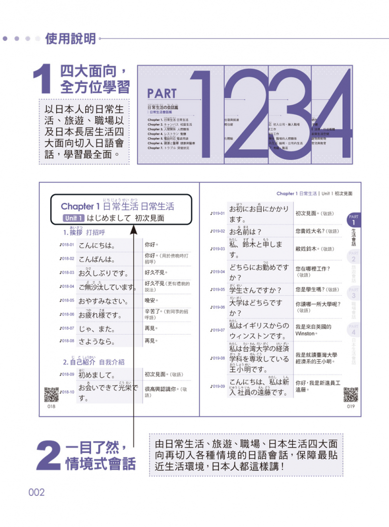 以日常生活、旅遊、職場、日本生活四大面向切入,再帶入各種情境,實用度最高。