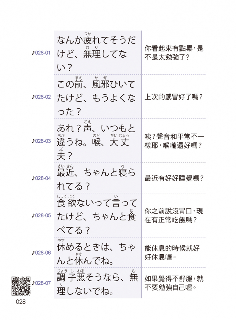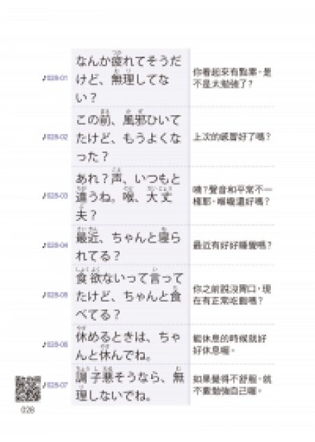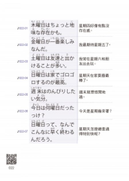 → 日常生活の会話篇 日常生活會話篇 (初次見面、時間與星期、心情、身體不適、每日的日常生活)