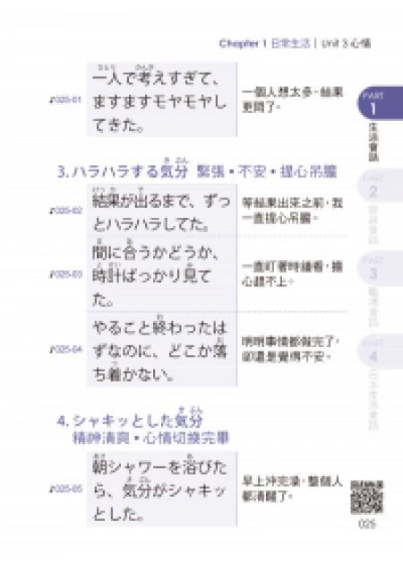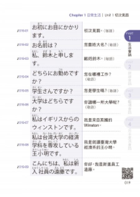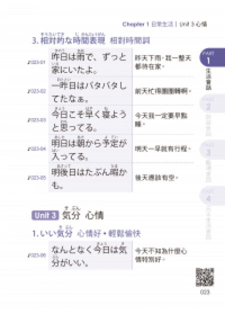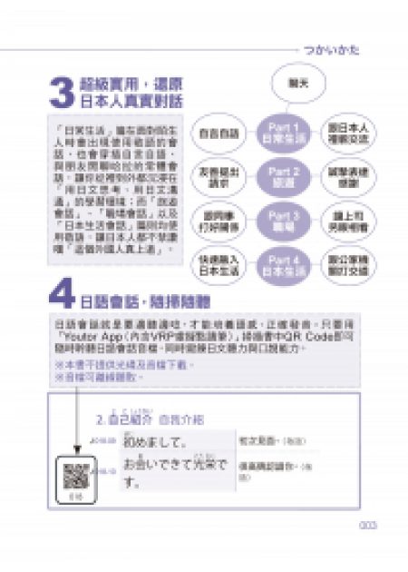 ● 日常生活篇:讓你在便利商店、校園、朋友聚會都能對答如流。遇到陌生人要用敬語,跟朋友哈啦就用常體,甚至還有自言自語的表達,讓你「裡外都像日本人」。 ● 旅行篇:帶你從機場到觀光景點都能用敬語應對,買票、問路、吃美食不再手忙腳亂。 ● 職場篇:專門為要在日本工作的人設計,從面試、自我介紹到辦公室交流,句句都能派上用場。
