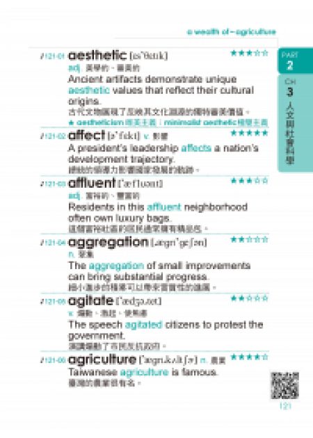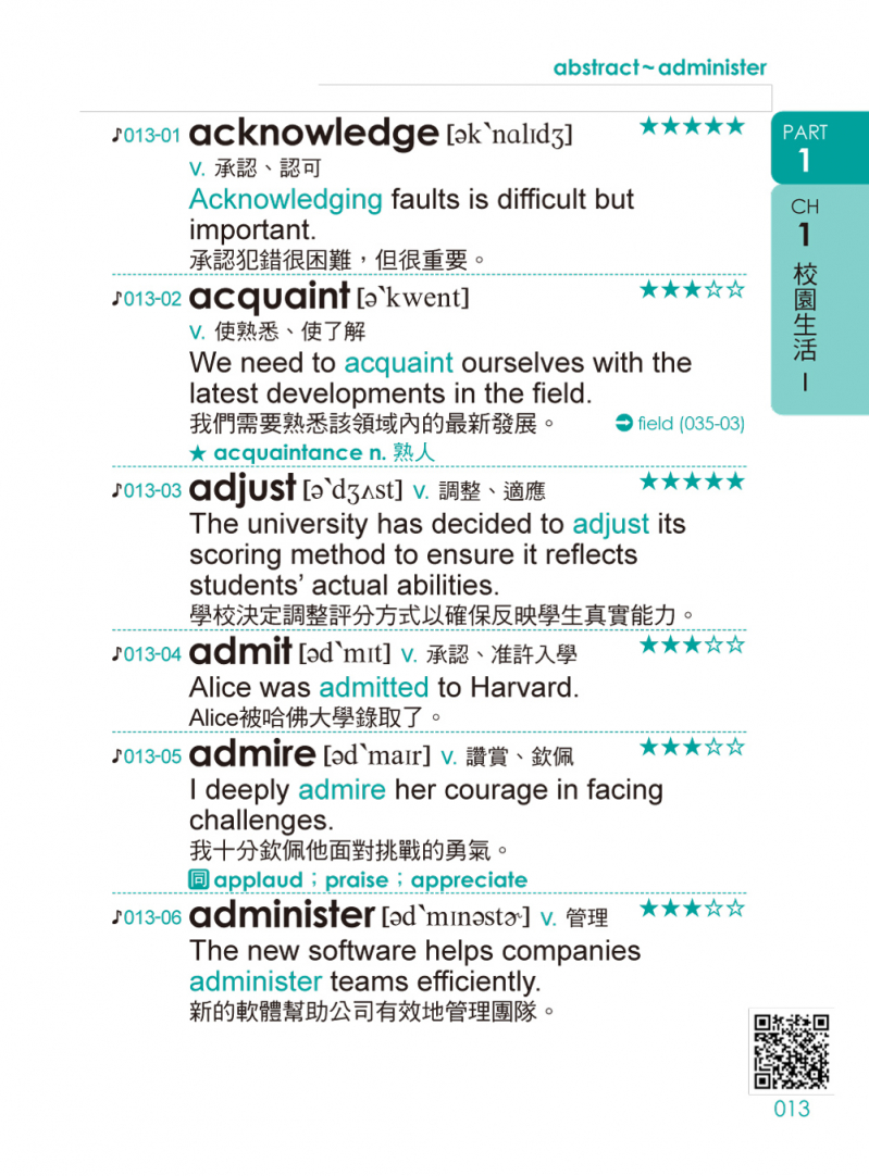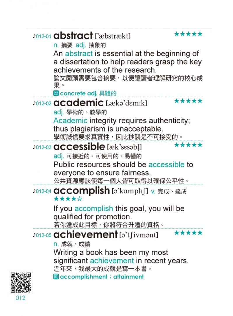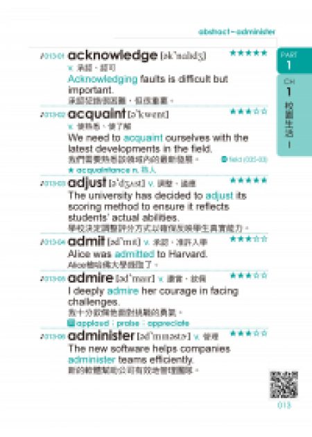 本書作者特別將每個單字依照在托福官方提供的線上模擬考試「TOEFL Practice Online(TPO)」的出現頻率進行星號標示,星星愈多表示出現頻率愈高、愈重要,時間不夠就先從重點單字開始學習才能更有效率。