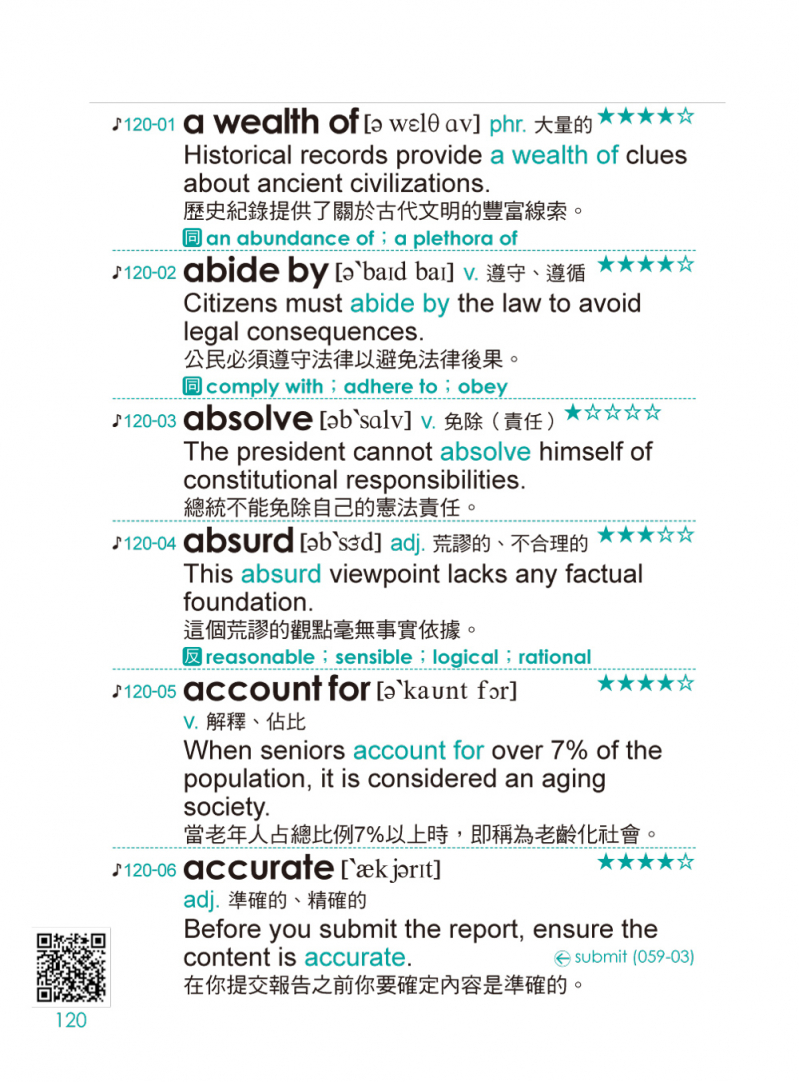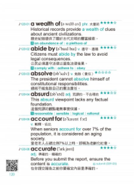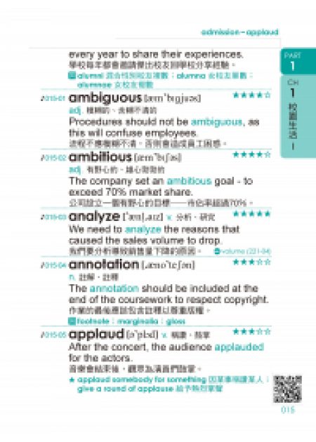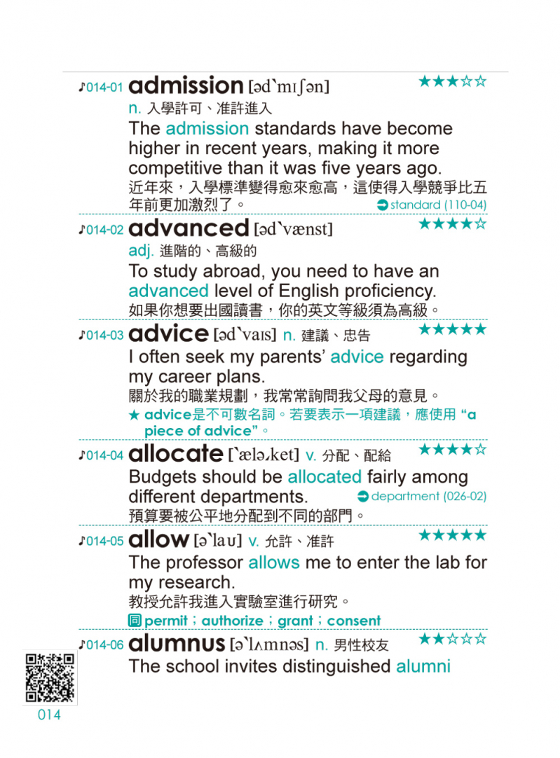 每個單字皆有標示KK音標、詞性和中文字義,先學會發音再記單字,每個單字還會補充同義字、反義字、常見搭配用法或例句,不僅僅只背單字,還要讓學習者了解如何靈活運用。雖然書籍小,但內容絕不偷工減料。