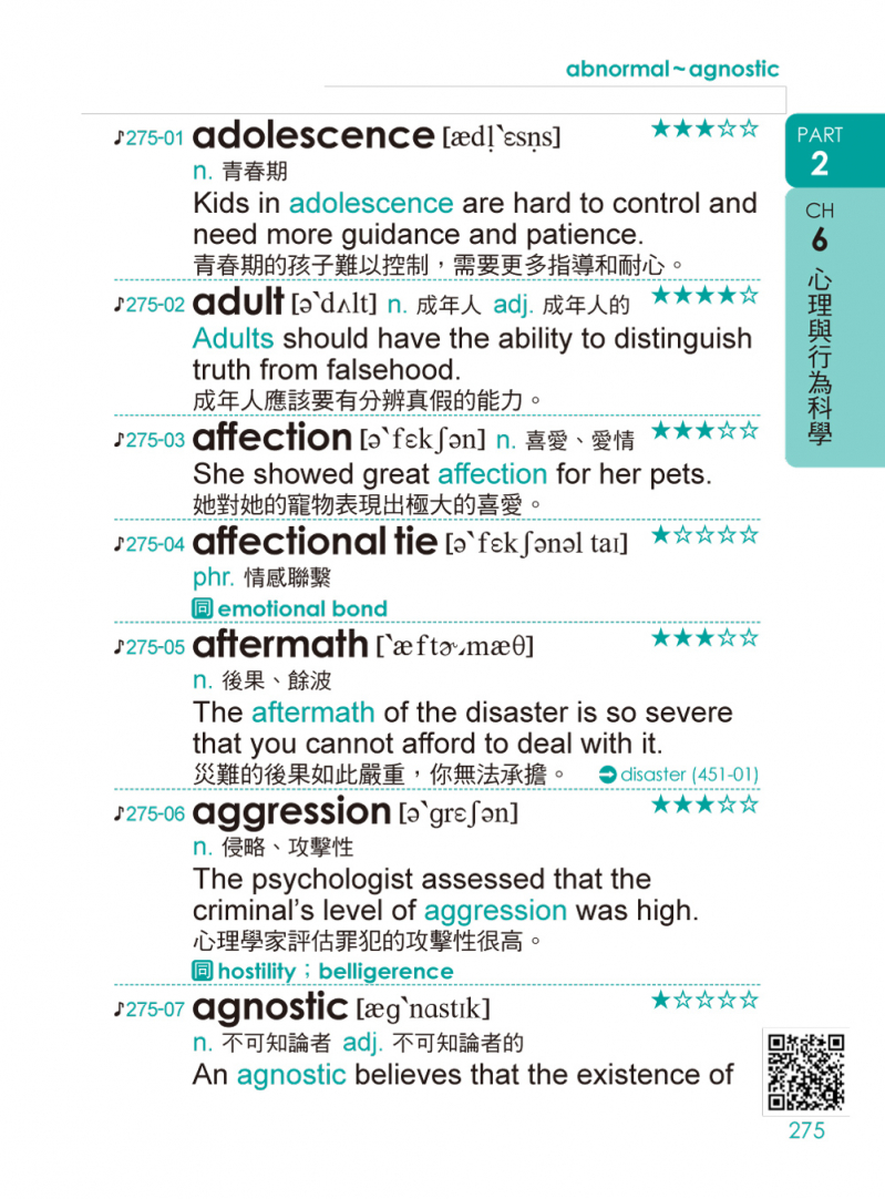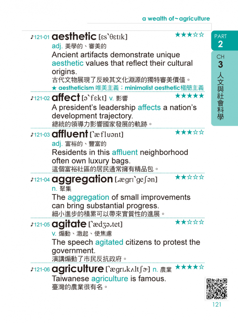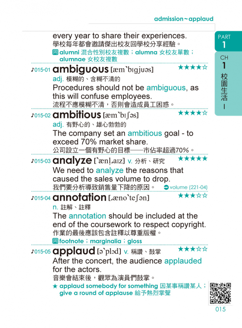 學單字不能靠死背,開口唸才能輕鬆牢記。只要用「Youtor App(內含VRP虛擬點讀比)」掃描位於書籍頁碼上方的QR Code,即可隨時聆聽美籍老師的單字、例句發音,同時鍛鍊英文聽力跟口說能力。