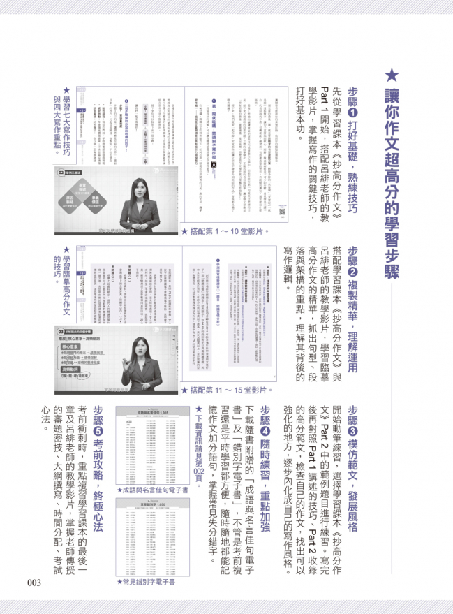 先從學習課本《抄高分作文》Part 1開始,搭配呂緋老師的教學影片,掌握寫作的關鍵技巧,打好基本功。