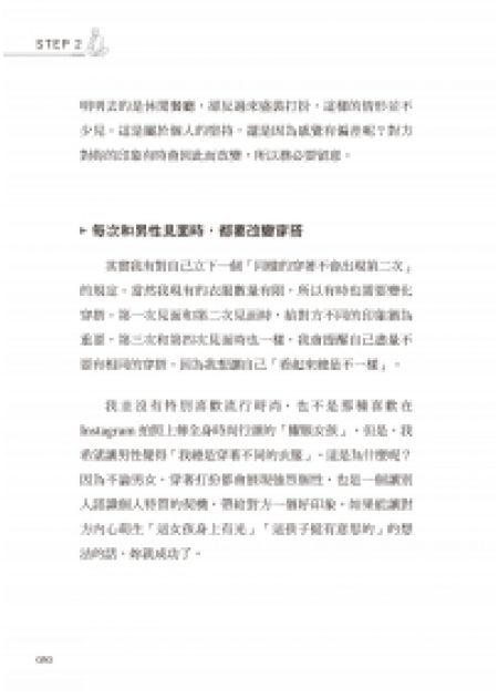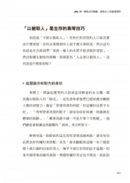 請妳想想看。當妳走在街上的時候,身邊都是五十幾歲、六十幾歲的大叔。而在大企業裡擁有重大專案決策權的人,都是五十幾歲經理級以上的大叔們。與其厭惡他們,不如了解他們的做事原則,逐漸拉攏他們成為自己人,建立起有意義的關係,人生才會更加豐富多彩。