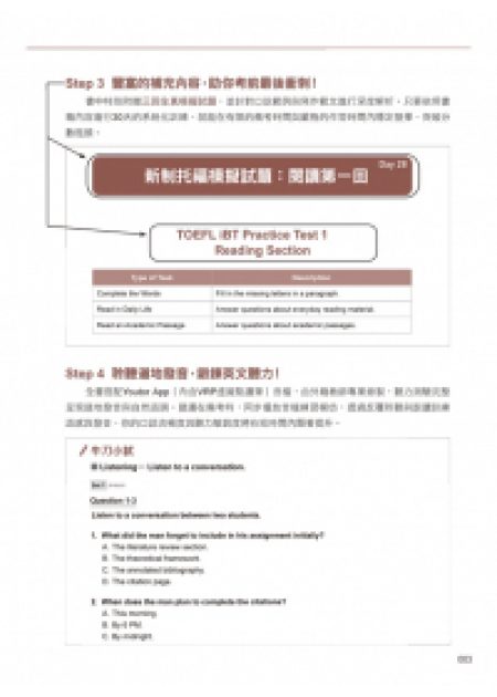 書中特別附贈三回全真模擬試題,並針對口說範例與寫作範文進行深度解析。只要依照書籍內容進行30天的系統化訓練,就能在有限的備考時間與嚴格的作答時間內穩定發揮,突破分數瓶頸。