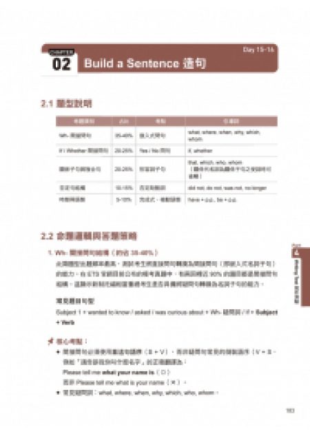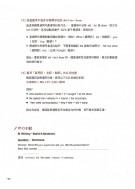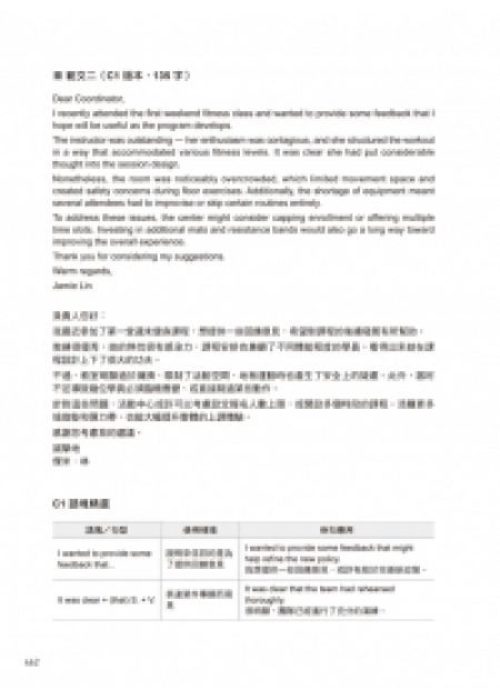 書中針對新制題型提供深度解析,包含閱讀的「單字補全」與「學術短文」、聽力的「判斷講者意圖」、寫作的「目標導向書信」及口說的「模擬面試」題。在學習過程中,請依照書中的步驟完成任務,並參考說寫部份的B2/C1/C2三階範文修正自己的表達習慣。