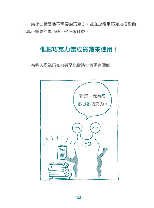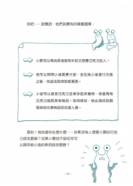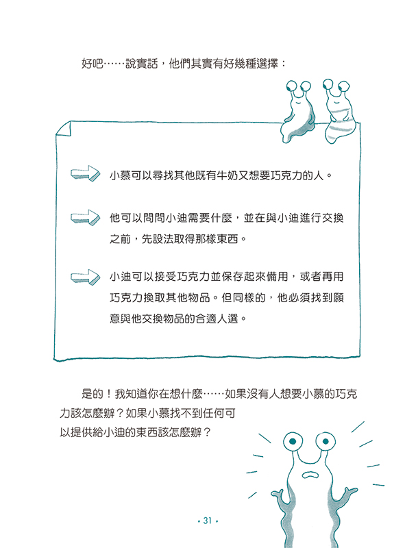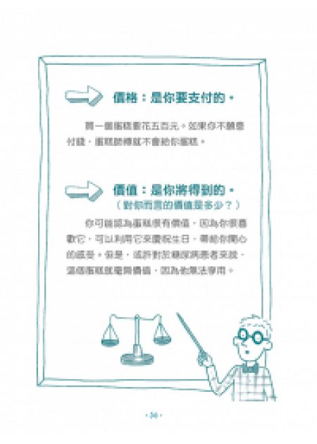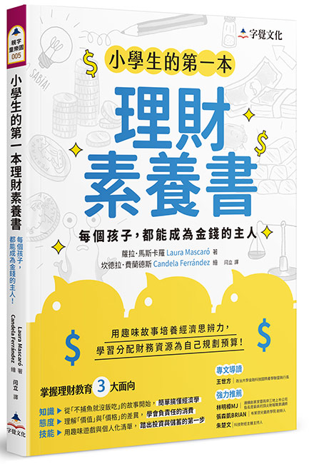 這是一本西班牙金融教育界名人蘿拉.馬斯卡羅(Laura Mascaró)的大作,以短篇故事方式,引導小朋友獨立思考,在每個小故事中,有趣的點出基本的經濟學觀念(供需、分工、以物易物……)、金錢觀(鈔票、貨幣、銀行、被動收入、價格與價值……),最後帶著年輕的讀者一起思考如何負責任的消費與理財規劃,從中獲得一生都受用的財務思維。