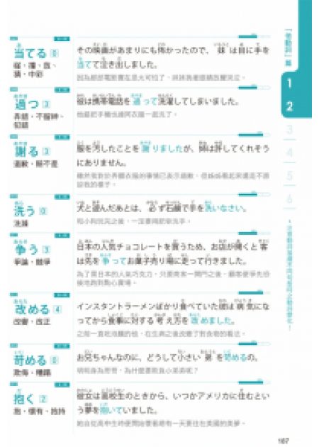 全書單字按照詞性分成6大章節:「名詞篇」、「他動詞篇」、「自動詞篇」、「形容動詞篇」、「形容詞篇」、「副詞 / 連体詞 / 接続詞篇」;各章節均清楚標示單字重音、詞性類別等相關學習內容,不僅加強單字,更提升應考實力,內容一應俱全,完整學習N3必會單字!